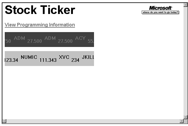 The Microsoft IE30 stock ticker control implements the display of continuous data. The main application is the stock market data. The data can be in text or the XRT format. The XRT format is the Microsoft Windows Open Services Architecture Extensions for Real-Time Market Data.