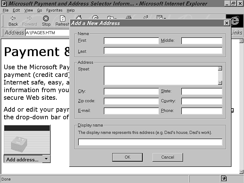 The Microsoft IE30 Payment and Address Selector control implements the secure address and payment information store at the local machine. You can use this control in your electronic commerce projects as a means to collect, save, and transmit credit card information, address information, and so on.