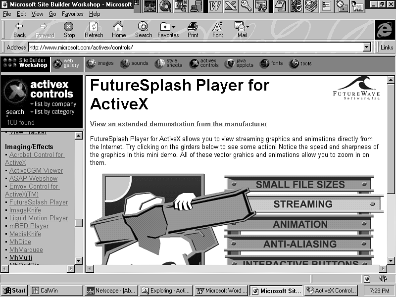 The FutureSplash Player Control for ActiveX from Future Wave Software, Inc. (http://www.futurewave.com) allows you to integrate and display Web animations created with the FutureSplash Animator within HTML page (see Figure 16.1).