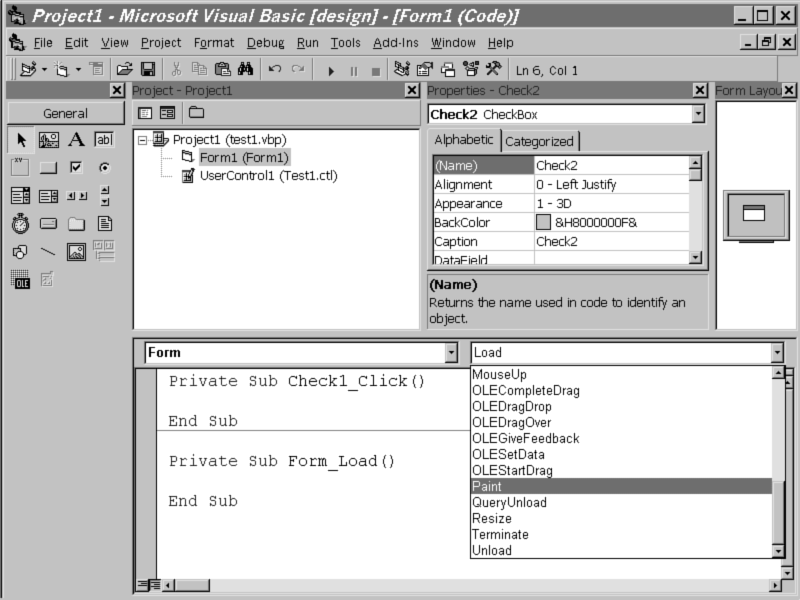 The focus of VBCCE is on reusability and development speed. The VB IDE with the forms package, intelligent, color-coded syntax, type-ahead editor with syntax reference and object model reference (Microsoft calls this intellisense technology), and object browser is the best in the market. The debugging facilities offered by the IDE are excellent. For starters, you can create new controls from scratch or customize existing ActiveX controls to fit an application or business problem. However, most of the developers will combine a set of existing ActiveX controls to develop a new ActiveX control module that implements a business function. You need not be an expert programmer to assemble a set of ActiveX controls to develop a single function using the VBCCE. |