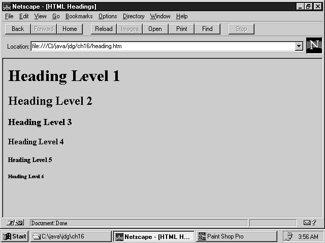 The heading and paragraph tags are the most common tags found within the body of a Web document. The heading tags are used to specify document headings. These headings are used to organize Web documents into sections and subsections in the same manner in which the chapters of this book are organized into sections and subsections. HTML supports six heading levels. First-level headings are identified by the <H1> and </H1> tags, second-level headings are identified by the <H2> and </H2> tags, and so on. Sixth-level headings are identified by the <H6> and </H6> tags. The HTML in Listing 16.2 shows how all six heading levels are displayed.