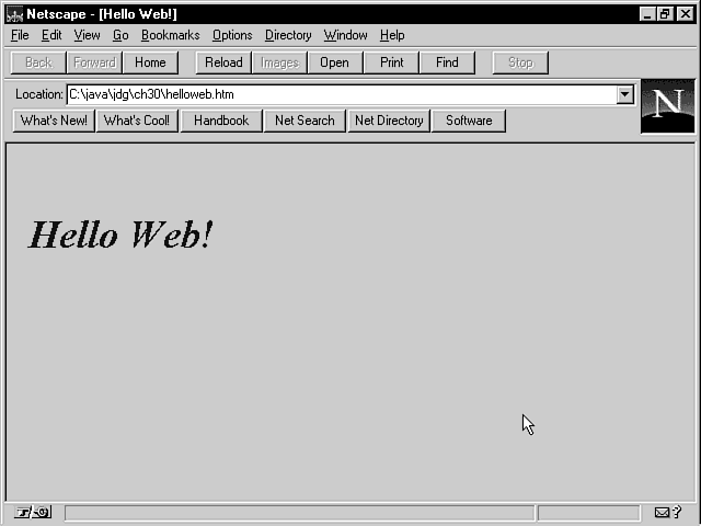Now open the helloweb.htm file with your Java-enabled browser. I use Netscape 2.0; my browser display appears as shown in Figure 30.1.
