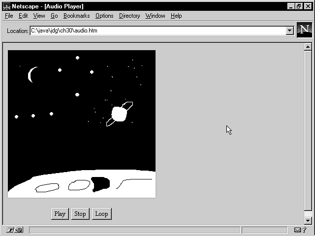 Your browser loads the audio.htm file and then the AudioPlayer.class file. The applet itself loads the background image and an audio file. To play the audio file, click on the Play button. The space music will be played, using your sound board and speakers. When the end of the music file is reached, the sound ends. If you click on the Loop button, the music will be continuously played in a never-ending fashion. Clicking on the Stop button causes the music to cease.