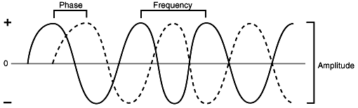 The first factor to be considered is whether network communications are conducted over an analog or a digital medium. Unbounded (that is, wireless) analog media, such as radio waves, are occasionally used for data networks in cases where physical access between two sites is limited and economic factors make unbounded and bounded digital links impractical. Analog signals can take any value within a specified range. Transition between two values is gradual, and cycles through the entire range, illustrated by the familiar sine wave signal pattern. The encoding of binary data into an analog signal involves the fluctuation of the signal's amplitude, frequency, or phase or a combination of these attributes, shown in figure 3.4. The distance (in signal strength) between the highest and lowest values of the sine curve is the amplitude. The distance (in time) between successive occurrences of the signal's highest value is its frequency, and two concurrent signals in which the highest values occur at different times are said to differ in phase. Regular variations in one or more of these attributes are used to signal the transition between values of zero and one, thus allowing binary data to be encoded. This is called modulation, and quite often, more than one of the three attributes is modulated to provide an additional measure of reliability.