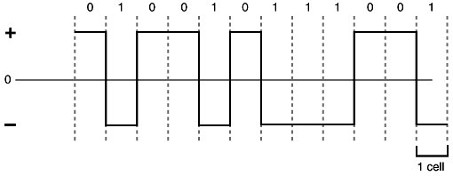 The problem with this system becomes evident, though, when two or more consecutive zeroes or ones must be sent. The bit stream is divided into cells, which are virtual divisions, each of which contains a single bit of data. When values alternate between zeroes and ones, the transitions delineate the boundaries of the cells. However, two or more cells in a row containing zero bits require no value transitions, and the receiving station has no precise method of tracking exactly how many zero bits are represented by a continuous value during a certain elapsed time.