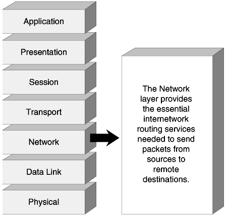 The network layer is where the most crucial dividing line in network communications occurs (see fig. 3.10), for this is the only layer that is actually concerned with the complete transmission of packets, or protocol data units (PDUs), from source to destination. The functions provided by the physical and data link layers are local. They are designed only to move the packets to the next station on the network medium. The primary task of the network layer is to provide the routing functionality by which packets can be sent across the boundaries of the local network segment to a destination that may be located on an adjacent network or on one thousands of miles away. What's more, the route actually taken by the packet must often be selected from many possible options, based on the relative efficiency of each.