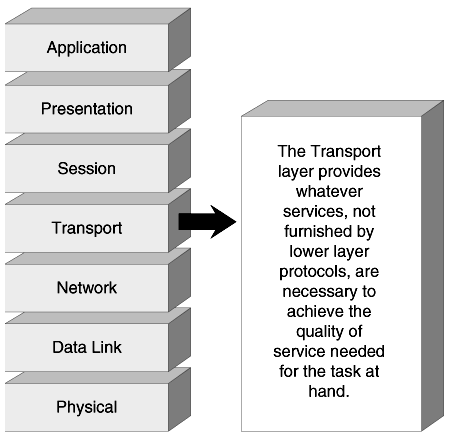 The transport layer (see fig. 3.12), as its primary function, provides the balance of the essential services not provided by the network layer protocol. A full-featured CO protocol at the network layer results in a relatively simple transport layer protocol, but as the functionality at the network layer diminishes, the complexity of the transport layer increases. The transport layer's task, therefore, is to provide whatever functions are necessary to elevate the network's quality of service (QOS) to a level suitable for the communications required of it.