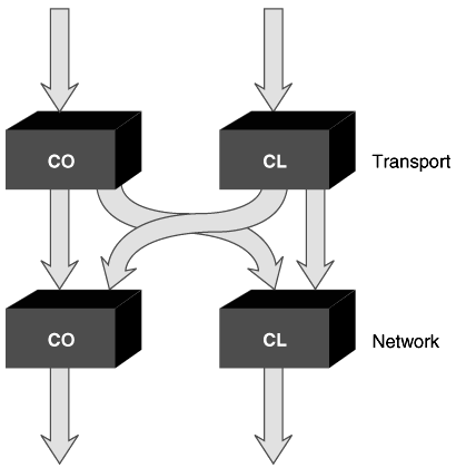 To perform this service, the transport layer, like the network layer, has the flexibility to utilize CO or CL protocols. The selection of the appropriate protocol to the task is referred to as mapping a transport service onto the network service, and any combination of service types is available. A CO transport protocol can be mapped onto a CO or a CL network protocol, and the same is true for a CL transport protocol (see fig. 3.13).