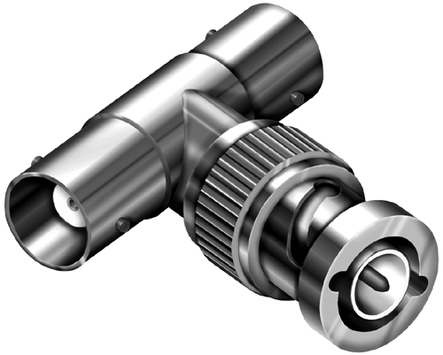Unlike thicknet, which may be tapped for attachment to a computer without breaking the cable, individual lengths of thinnet cabling are used to run from one computer to the next in order to form the bus topology (see fig. 7.6). At each Ethernet interface, a "T" connector is installed. This is a metal device with three Bayonet-Neill-Concelman-type connectors (BNC): one female for attachment to the NIC in the computer, and two males for the attachment of two coaxial cable connectors (see fig. 7.7). The cable at each machine must have a female BNC connector installed onto it, which is attached to the "T." Then a second length of cable, similarly equipped, is attached to the third connector on the "T" and used to run to the next machine. There are no guidelines in the standard concerning cable lots or the number of breaks that may be present in thinnet cabling. The only rule, in this respect, is that no cable segment may be less than 0.5 meters long.