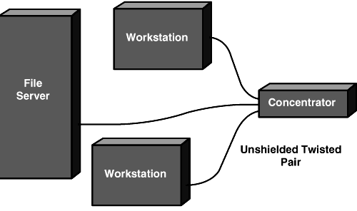Unlike both thicknet and thinnet, 10BaseT in not installed in a bus topology. Instead, it uses a distributed star topology, in which each device on the network has a dedicated connection to a centralized multiport repeater known as a concentrator or hub (see fig. 7.8). The primary advantage to this topology is that a disturbance in one cable affects only the single machine connected by that cable. Bus topologies, on the other hand, are subject to the "Christmas light effect," in which one bad connection will interrupt network communications not only to one machine but to every machine down the line from that one. The greater amount of cabling needed for a 10BaseT installation is offset by the relatively low price of the cable itself, but the need for hubs containing a port for every node on the network adds significantly to the overall price of this type of network. Two devices can be directly connected with a 10BaseT cable that provides signal crossover, without an intervening hub, but only two, resulting in an effective, if minimal, network.