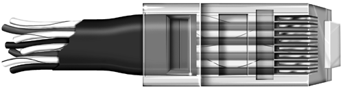 An RJ-45 connector looks like a telephone cable connector.