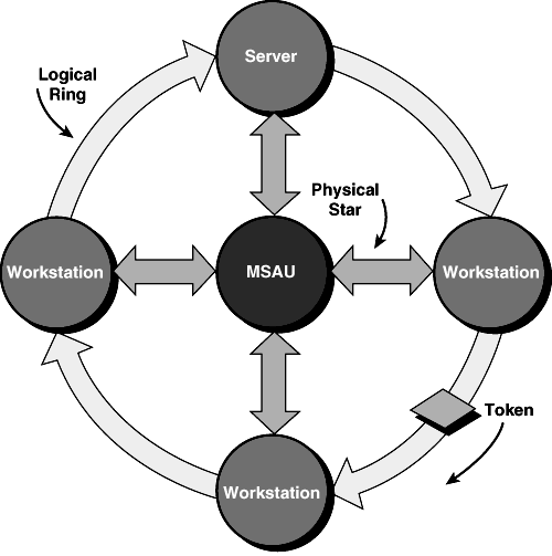 This is a basic token-ring network, showing both the physical star topology and the