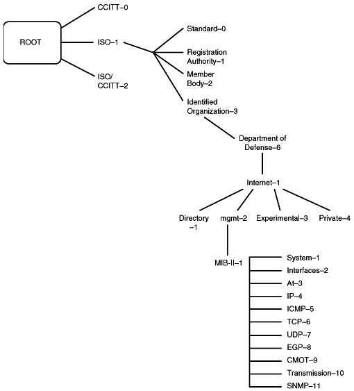 Each object in the MIB is uniquely identified by a kind of addressing, called the Object Identifier (OID). The OID is a convenient notation for locating a MIB object, and you will often see it referred to on Network Managers when you query a device's configuration or status. When the IETF defined the MIB, they attempted to build a "tree" that includes not just information on the MIB standard, but information about other kinds of information, including definitions for other organizations besides the IETF, and other types of information other than network management. While this may seem like a lot of information, the MIB-II standard represents just one "branch" on the tree. In figure 30.1, you see the whole tree, starting at the root of the tree and presenting all of the relevant "leaf objects" that lead to where the MIB-II definitions are. The reason we need to follow the tree from the root to the MIB-II part is that the OID refers to the MIB starting from the root. Within the MIB-II tree, each standard object that defines an element on a managed device is referred to by a unique OID.