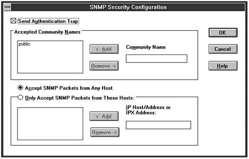 Implementing SNMP in IP and Novell Environments. Most major NOSs today come with support for SNMP. What this means is that they provide agent software running on both client and server. In the TCP/IP environment, this may come in the form of the snmpd daemon on a UNIX system or the SNMP Service on a Windows NT workstation or server. In the Novell environment, you can implement the SNMP NLM over either IP or IPX. Figure 30.2 shows the SNMP configuration options for Windows NT.