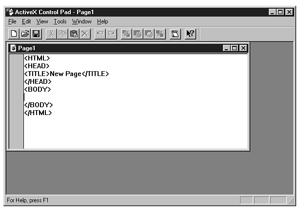 The ActiveX Control Pad has been jokingly referred to as Visual N++ or Visual Notepad, because it strongly resembles the Notepad application, but with a toolbar and a few extra visual elements. Figure 10.2 shows the initial screen of the Control Pad. Although it might resemble Notepad on the surface, it has a lot of power under the hood.