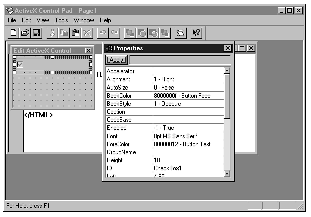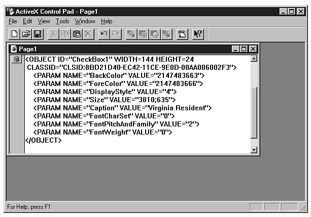 The most useful feature of the Control Pad is its capability to insert all the necessary HTML code for an ActiveX control. You even can edit the properties of a specific control that has been inserted into your page, by using an interface similar to the Visual Basic Properties dialog.