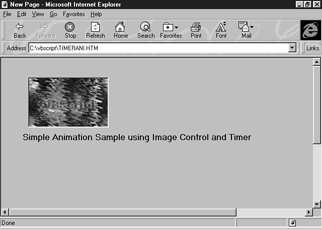 First, the example displays an HTML layout (shown in Listing 17.1) called TimerAni that contains an Image control called Image1 and a Timer object named Timer1. These control names are the defaults generated by the ActiveX Control Pad and have not been modified to avoid any confusion.
