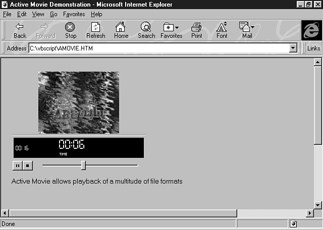 VBScript does not have internal structures or data types that allow it to handle digital video and audio playback, but coupled with Microsoft's ActiveX controls, many impressive types of animation can be achieved. Not only can you display an array of visual and audio data, from MPEGs to Stock Quotes, but many applications can have a level of interactivity far beyond simple frame-by-frame playback, by using Visual Basic logic. The following examples will give you some guidelines for setting up this interactivity.