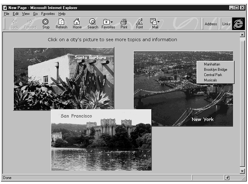 (The Click event can't be used because it's not invoked with the right mouse button.) The code tests which button was pressed, and if it wasn't the right button it exits the subroutine. (You would probably execute a different command for the Click event.) Then the IEPop1 menu is cleared and populated with the menu items that apply to the image of New York City. The last statement causes the popup menu to be displayed on the window. The MouseDown event handlers for the other two Image controls are quite similar. They simply add different options to the popup menu.