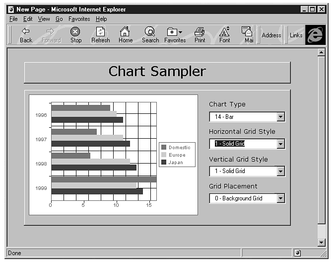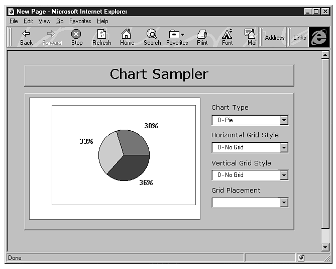 The Chart control is the last of the new ActiveX controls we are going to cover in this book. If you are using some visual programming tools in the Windows environment, you have realized that the ActiveX controls are nothing more than the regular OLE controls that make up the Windows user interface. You are probably wondering whether you should attempt to use the OLE controls already installed on your system. Most of the OLE controls can be used, and we'll look at a few of them in the last part of the book. However, they are not ActiveX controls and the viewers will get a warning every time they open a page that contains old OLE controls (implemented in OCX files). You can use the existing OLE controls on your pages in an intranet environment, and you are going to find interesting examples in the last section of this book.