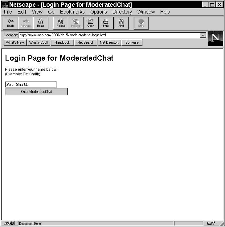 When the user enters the ModeratedChat environment, it doesn't appear that the environment is being monitored (see Fig. 15.12). The user has no idea that there is someone else watching over the chat dialog. For the person monitoring the moderated chat environment, there is a special page generated by the CGI script moderate.cgi in Listing 15.3.