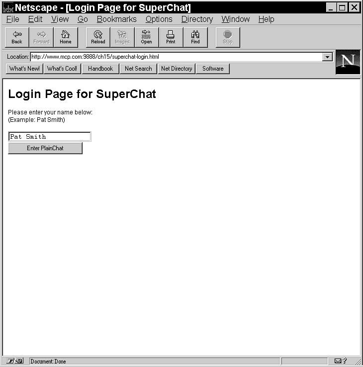 SuperChat is a Web chat application with three main components. First, there is the CGI script that handles data from the login form and the transcript page. The login form and transcript page contain HTML forms for gathering and passing data (see Fig. 15.1).