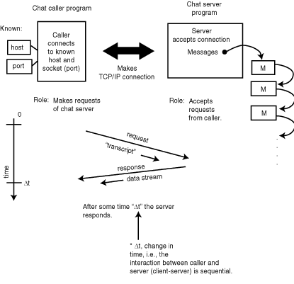 Elsewhere in the Chat Server and Chat Caller programs are functions for handling memory management and for recognition of requests made to the Chat Server. Utility functions for dumping the transcript log back to the Chat Caller, string operations, and formatting operations are all listed as separate functions built into the Chat Server and Chat Caller programs.