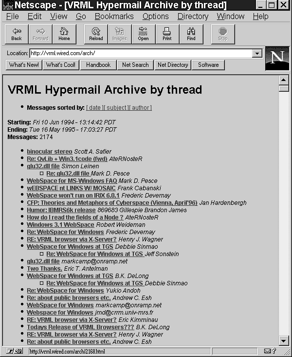 Hypermail produces a set of index files for all the messages within a particular forum. Figure 31.2, earlier in this chapter, shows an example of the subject index for a forum on VRML at wired.com.
