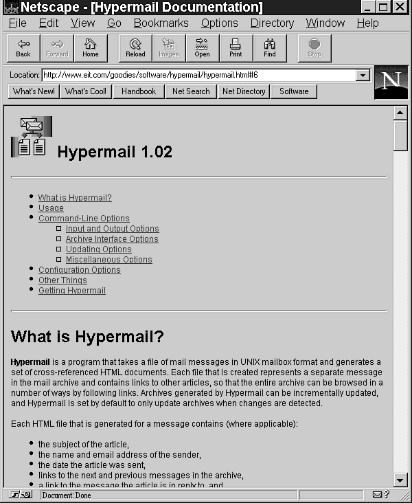 There is a great HTML page on the Web that contains very specific information about Hypermail. That page is located at http://www.eit.com/goodies/software/hypermail/hypermail.html. See Figure 31.1.