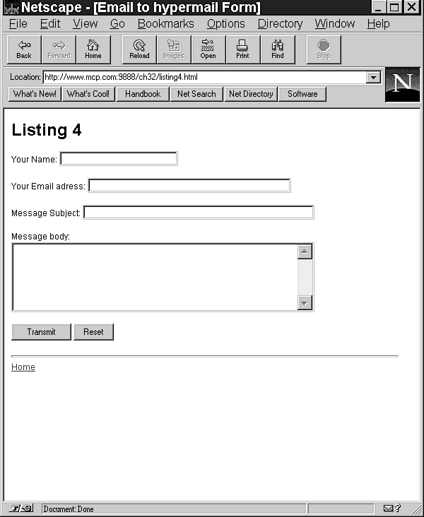 The CGI script in Listing 31.4 actually uses e-mail to send the message through Hypermail, but users don't have to deal with that technicality. As far as they are concerned, e-mail plays no part in how messages get from their keyboards to the forum on the Web. See Figure 31.4 to see how this would look.