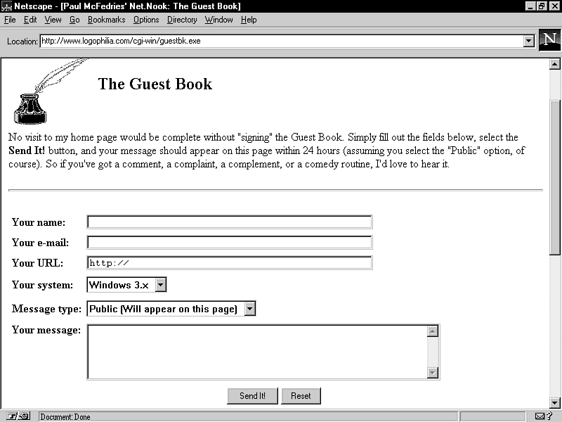 A form is simply the Web-page equivalent of a dialog box. It's a page populated with text boxes, drop-down lists, and command buttons to get information from the reader. For example, the picture below shows a form from my Web site. This is a "guest book" that people "sign" when they visit my Web abode. Although most new browsers can handle forms, some older browsers may choke on them.