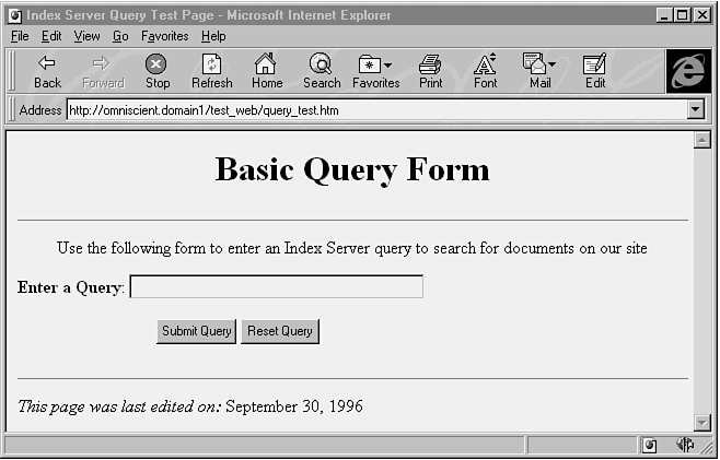 This form was created in only a few minutes. Note that query forms can be customized and made much more functional by adding form elements. Additionally, custom modifications, such as adding ActiveX controls or references to VBScript scripts, are easily performed manually after the base HTML page and form elements have been created.