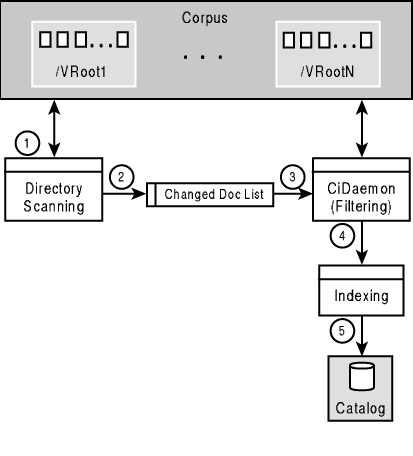Figure 10.1. This figure illustrates the process by which a catalog is populated with index and property information for documents stored in indexed virtual roots at a site.