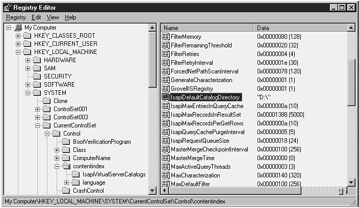 Figure 10.2. This highlighted registry entry shows the location of the default catalog to be used by Index Server.