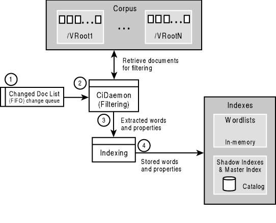 As previously stated, words and document properties extracted during document filtering are first added to word lists. From there, they propagate through shadow indexes and eventually become part of the master index.