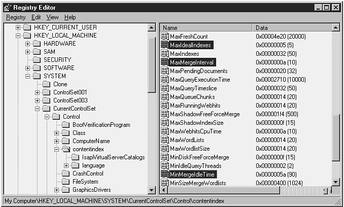 The value of the MaxIndexes registry parameter specifies the maximum total number of persistent indexes allowed in the catalog. If exceeded, Index Server performs a shadow merge (using shadow indexes as source indexes) to bring the total number of indexes below this value. The default value is 50. Figure 10.7 shows the values for this registry setting on our system.
