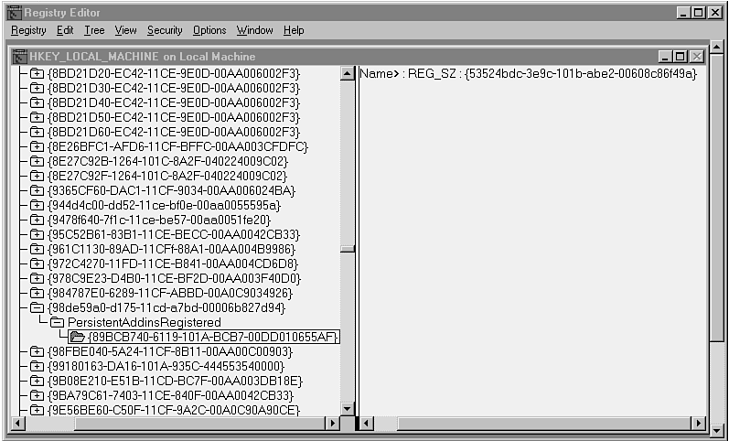 Figure 11.4 displays the PersistentAddinsRegistered registry entry for a Microsoft Word document.