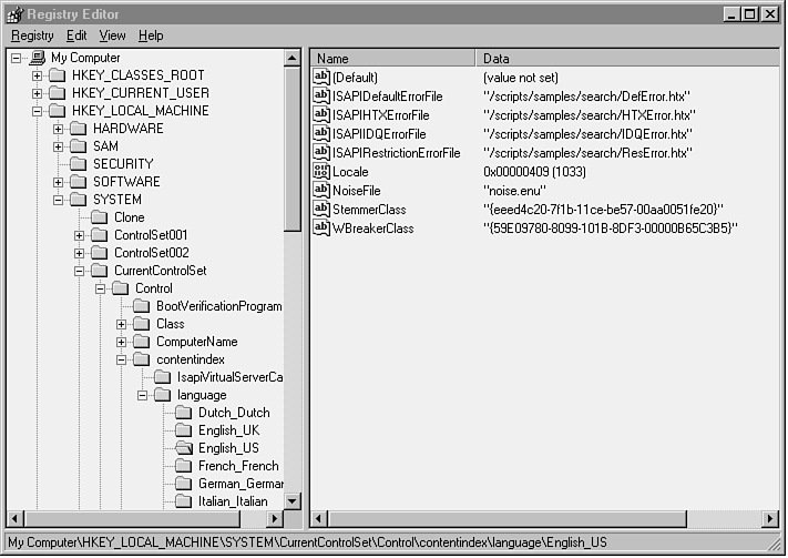 Language-specific registry parameters control the selection of word-breaker, stemmer, and noise-word lists for a given language. They also select the error pages returned in response to invalid user and administrator actions. Using the regedit program, you can find and edit these parameters under the following path: