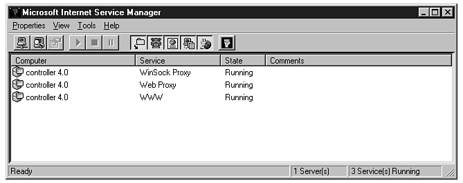 When Microsoft Proxy Server is installed, it attaches itself to the same control interface used by other IIS servers. This control interface is accessed through one of two points. The Internet Service Manager can be started from either the Microsoft Internet Server folder or the Microsoft Proxy Server folder. Figure 2.8 shows the service manager: