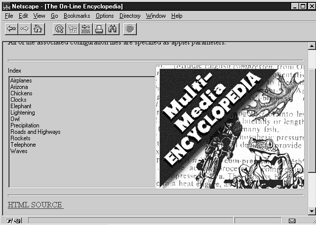 To make the applet as flexible as possible, all of the display options are specified as either applet parameters or in configuration files. The encyclopedia cover page (image file name) and the index file are specified in the applet parameter list. The topic configuration filename is a field in the index file (associated with the index listing), which references a file that contains fields specifying an image filename, a sound filename, and a textual description of the topic. Thus, the encyclopedia can be easily modified without changing the underlying Java source code.