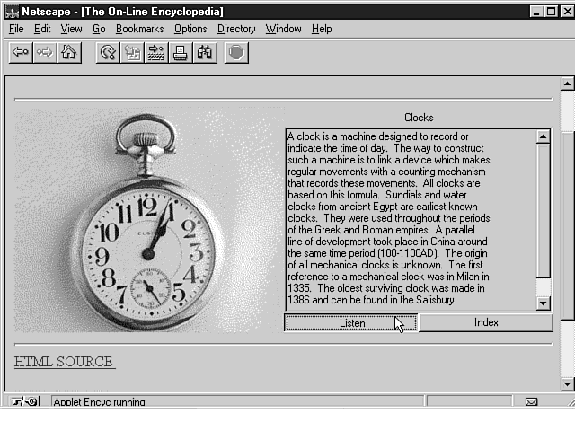 This applet is designed as a public domain multimedia encyclopedia; it provides all the features of a Multimedia Encyclopedia short of video streaming. It is a good example of an application that can be written in a few hours and still be very useful and easy to improve in the future. Remember, the next time a user accesses the encyclopedia, he or she could see a greatly improved user interface, as well as better content.