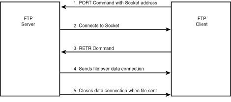 Whenever an FTP server needs to transfer raw data to or from a client, it uses a separate data connection for the transfer. Normally, the client sets up a listen socket (in Java, a ServerSocket) to accept an incoming connection from the FTP server. The client then sends the host address and port number of the listen socket to the server using the PORT command. The format of the PORT command is: