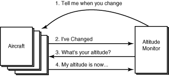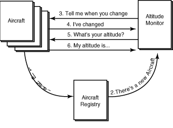 Figure 9.8 shows the relationship between an aircraft, the aircraft registry, and the altitude monitor.
