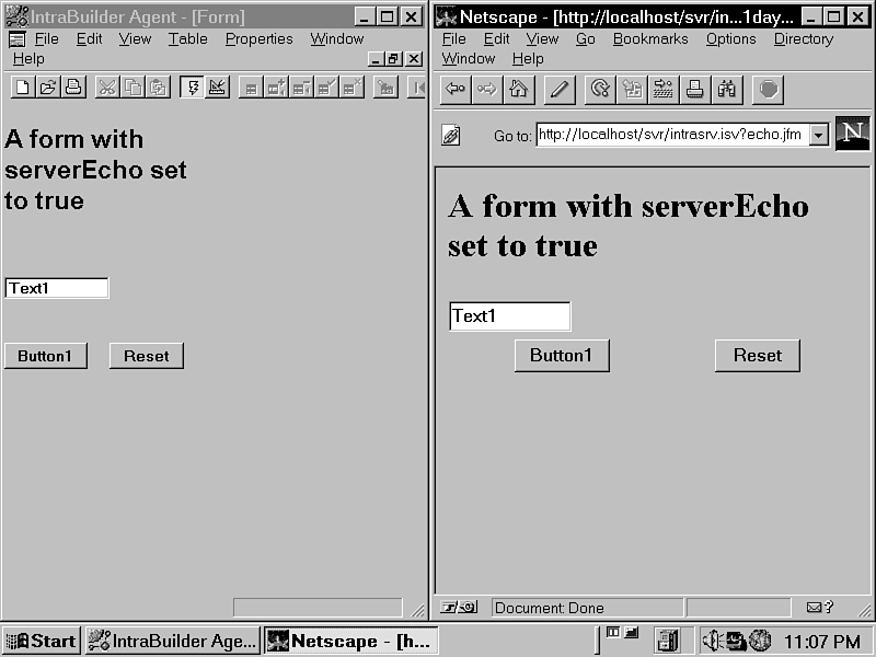 If you have both the serverEcho registry setting and the serverEcho property set, you can see forms open in the agent and the browser. Figure B.5 shows the form in Netscape Navigator and the echo image in an IntraBuilder agent.