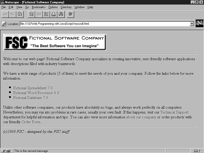 Listing 11.1 shows the nonscrolling message program integrated into the FSC Software home page. You'll look at the program in detail later.