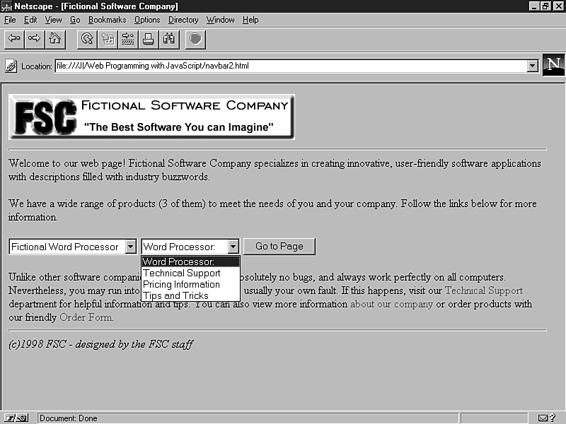 As you can see, this is a much more interactive use of JavaScript-and a more practical one because you will rarely have exactly the same list of pages for each product. This could easily be adapted for a wide variety of uses.