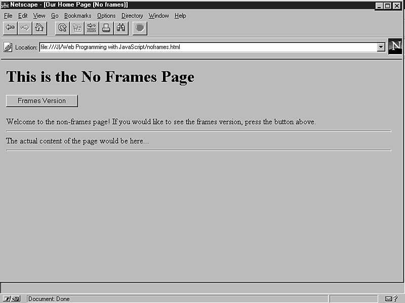 This example is a useful application for cookies (Chapter 9). You will use a cookie to indicate the user's preference and either display a frames or no-frames version of the page.