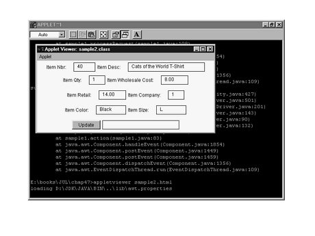 Also consider the processRequest() method; it uses the JDBC wasNull() method to check the code to see whether a value is returned from some fields. This function is called after the get method to see whether the returned result is null. You should make this check on any field defined as optional (that is, any field for which null values are allowed) in the database. Fig-ure 44.5 shows the newly loaded applet in the applet viewer.
