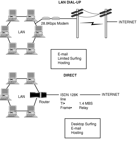 Figure 12.1: LAN dial-up and direct connections to the Internet.
