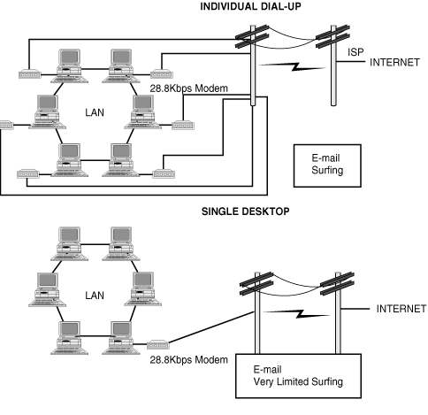 Figure 12.2: Individual dial-up and single desktop connections to the Internet.